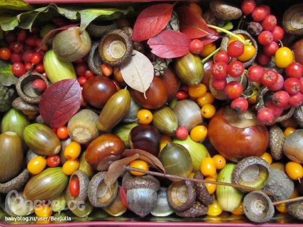 Юлия. может быть хоть вы ответите... Чего делать то с такой коробкой?!?! Просто копатся там? У нас тут осень на КИпре - мягко скажем - когда договорились тогда и осень. обычно в октябре мы ездим в горы в лес - и я планирую собрать свою коробку для детей. Из мелких гранатов, виноградных листей, может фундук еще найдем, плоды перца - и еще чего желтого-красного найдем. Дубов на Кипре много - постараемся желудей набрать. Но сын уже меня замучил - а как с ней играть? Мелкая найдет конечно как - пирожных напечет куклам, суп сварит, просто пороется и т.д