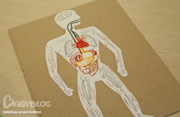 Игры и игрушки для ребят от 3 лет и старшеПо мотивам книги решили сделать аппликацию. Быстренько набросала контур человека, наметила кости, венки, отдельно нарисовала известные Данюшке органы. Сынок приклеивал их и рассказывал назначение.