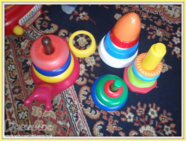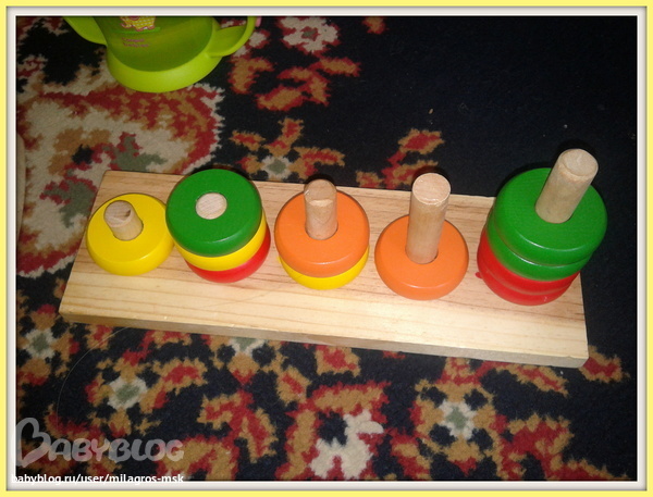 Играли с геометрическими пирамидками от "Стеллар", убрала пока треугольник и шестиугольник. Мальчишки без ошибок насадили детальки.