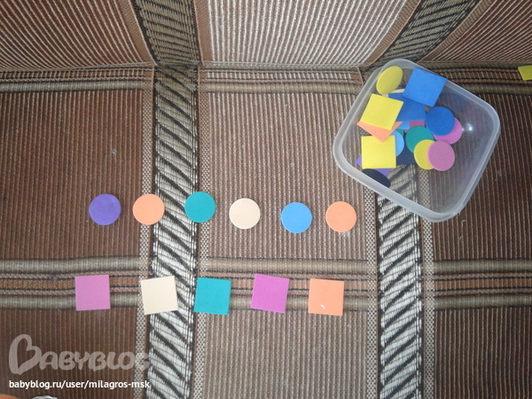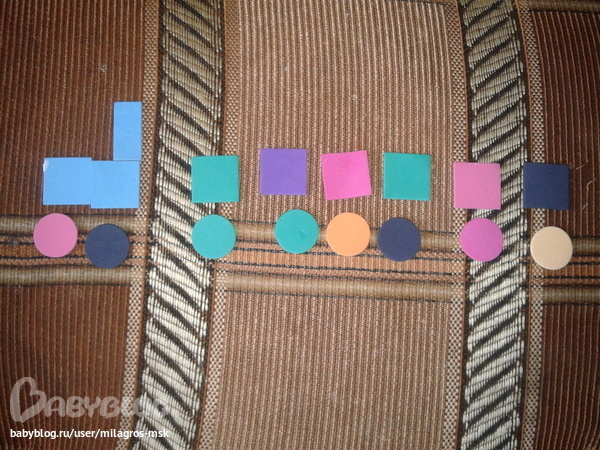 Вернулись к счетному материалу от "Пирамиды октрытий", искали квадраты и круги. Потом я решила сделать поезд из них, мальчишкам понравилось=)