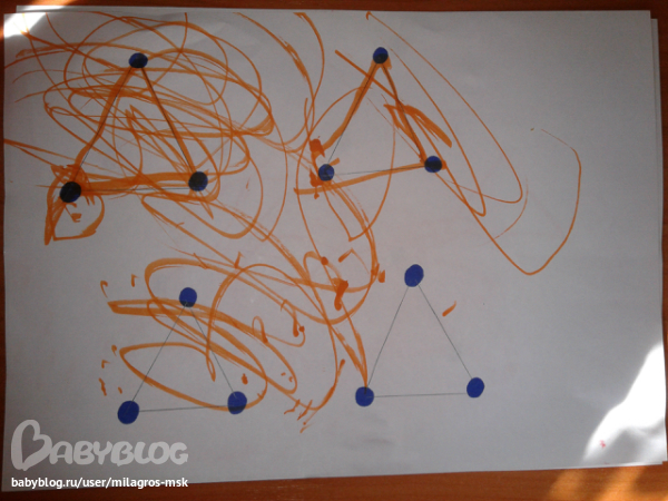 Учились соединять точки-углы, чтобы получить треугольник. Больше понравилось, конечно же, калякать=)