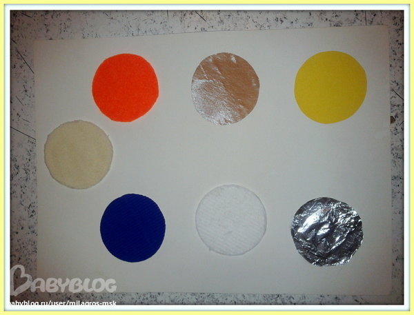 Утро начали с тактильной карточки: на лист картона наклеила круги из разных материалов: фольга, флис, толстый фетр (3 мм), ватный диск, гофрированный картон, ткань типа парчи, бархатная цветная бумага. В течение дня брали карточку, рассматривали, трогали, гладили. Больше всего понрался гофрированный картон и мне, и детям.
