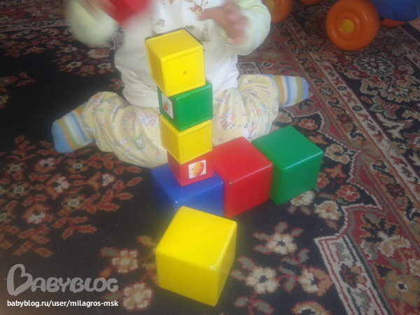 Играли много с кубиками: рассматривали, показывала углы и стороны. Строили башни, Максим сам продумал сделать плоскую башню, т.е. просто начал расставлять кубики друг за другом, причем начал с больших, а закончил маленькими, и решил, что это поезд=)) Сфотографировтаь не успела, к сожалению.