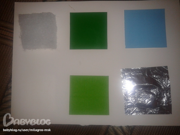 Сделала для малышей тактильную карточку с квардатами: гофрированный картон, синтепон, глянцевая бумага, бархатная бумага, фольга.