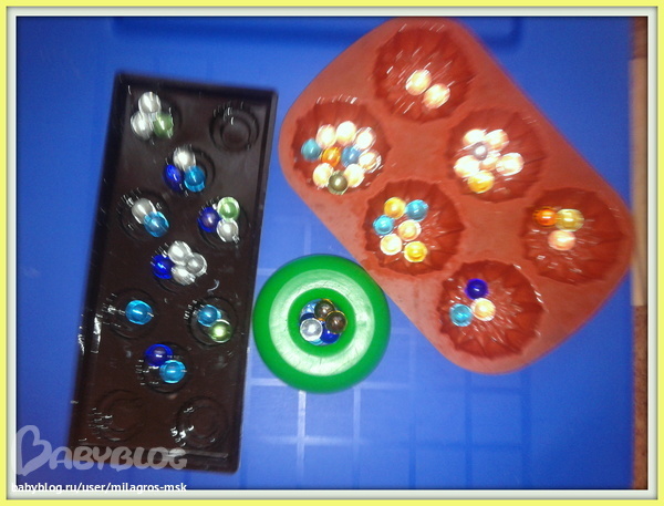 С огромным удовольствием играли со стеклянными шариками под моим чутким руководством и пристальным вниманием: катали шарики между ладонами, перебирали в тарелочке, раскладывали по ячейкам. Бутытки пластиковой не нашлось, пришлось использовать кольцо от пирамиды и закидывать шарики в дырочку. Учила катать шарик между двумя пальцами.