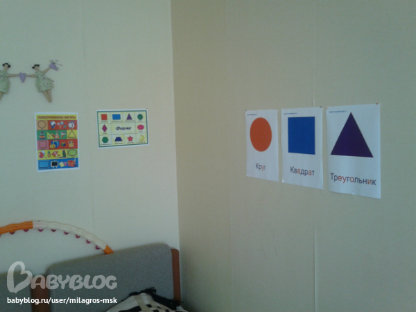 По мере изучения фигур по одной вешаю на стену картинки, заодно повторяем изученные фигуры. И распечатала плакатики с формами и предметами, на них ищем фигуры. По ходу изучения круга, квадрата и треугольника Максиму очень полюбился овал, запомнил фигуру, название, сам находит и говорит "ова!"