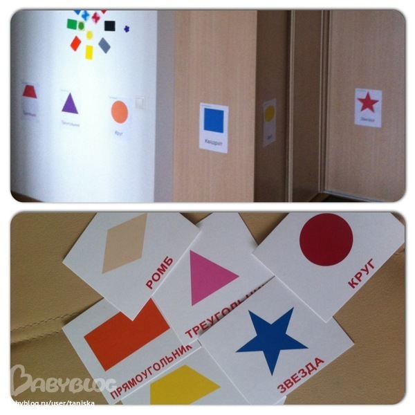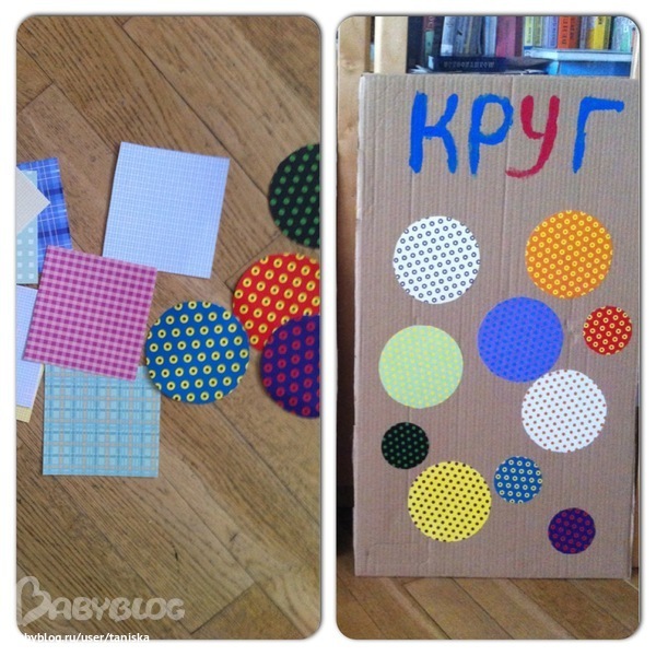 Конечно, для малышей самое главное - это играть. С геометрическими фигурами играли мы очень много. Кроме пирамидок и кубиков в ход пошли самоделки - вырезала из цветного картона круги, квадраты, треугольники. Мы их раскладывали по кубикам, сажали на них игрушки, складывали в конвертик и т д. В конце-концов мы их наклеяли на большой лист картона и получились плакаты для каждой фигуры.