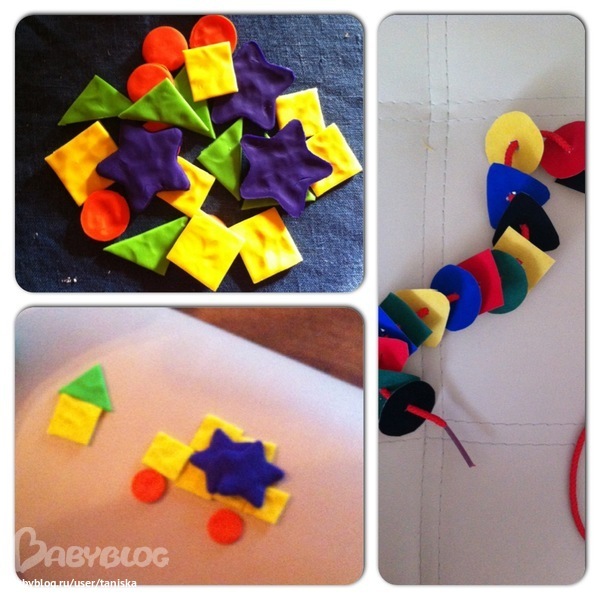 Сделала из пластика фигурки, запекла в духовке и получилась такая тактильная мозаика (делала сама пальцами - потому остался рельеф). Из фигурок составляли машины, домики, елочки и т д - предметы, понятные малышам. Еще сделала из бархатной цветной бумаги фигурки с дырочкой посерединке - получилась шнуровка-бусы (тоже тактильная, получается, игрушка):