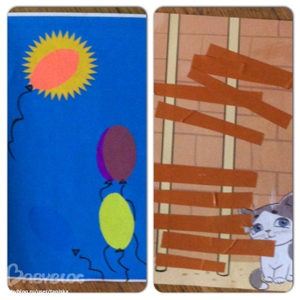 Воздушные шары в небе - особенно мне нравятся. Сделала в ворде синий фон и солнце. Овалы из клейкой бумаги - доченька сама наклеяла. Я подрисовала ниточки. Так эстетично получилось - даже подарить бабушке, например, не стыдно. С лесенкой для киски сложнее получилось. Но я не рисовала для палочек метки (как например, сделано в гусенице). Поэтому палки немного отклонились от лесницы, но мне кажется, вполне мило))