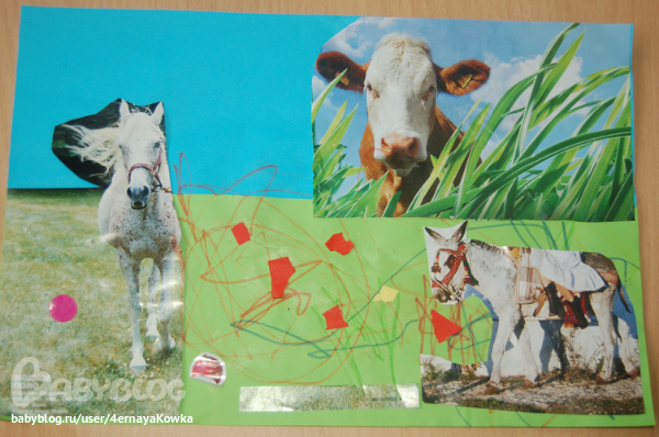 Сделали аппликацию «На лугу». Сначала просто приклеили животных, а потом начали творить: Вика нарисовала «травку», «цветочки», клеила все подряд наклейки, а еще порвали бумажки и сыпали на намазанный клеем лист – получилась цветочная полянка.