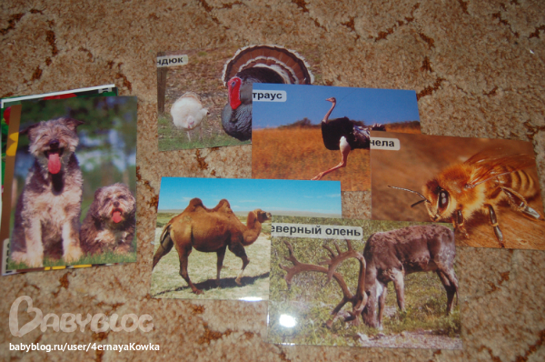 Первый день у нас был обзорный. Хотела повесить на стенку небольшой плакат, но потом решили играть с ним так – показывали животных и расставляли игрушечную живность по их картинкам.