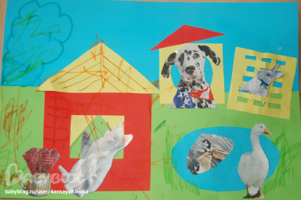 Покормили кошечку и собачку разными крупами (сыпали на намазанный клеем лист с рисунком животных и мисочек) И сделали вот такую аппликацию, с домиком для кошечки, собачки и даже клеткой для кролика, и заодно прудом для птиц.