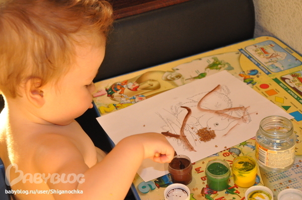 Рисуем гуашью, перед этим на место орешка наклеили гречку.