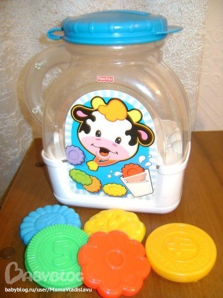 Игры и игрушки для карапузиков от 0 и до годаКувшинчик подобие копилки,в специальное отверстие в крышку кувшина можно кидать разноцветное печенье,если кувшин наклонить можно услышать мычание коровы