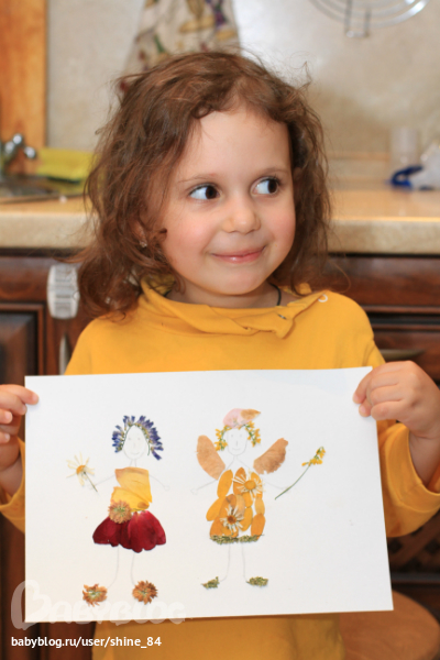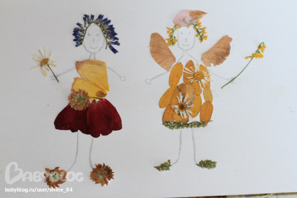 Мистер Умелец или Очумелые ручки (поделки, аппликации, интересные находки, идеи и задумки)Насобирали как то с Аней кучу листьев и лепестков цветков. Засушили как могли. (Как вы сушите или подготавливаете листья к аппликациям?) Из кучи в приличном виде осталось совсем немного. Но нам хватило, чтобы воплотить мою задумку. Дочка-мечтвтельница, после мультика о динь динь, часто говорит о феях. Вот их и решили изобразить. Кажется получилось не плохо)