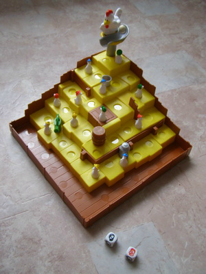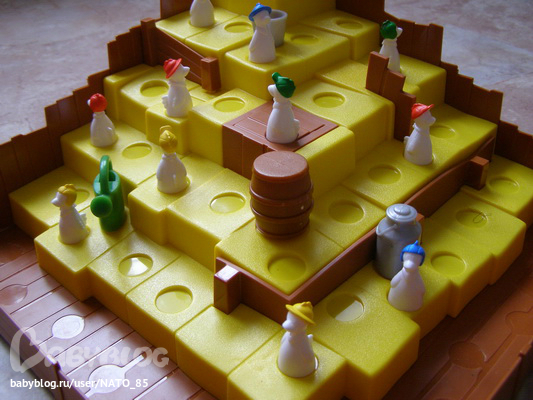 Лиза умеет играть как по привалам игры, так и по своим собственным. умеет ждать своей очереди, кидать с деловым видом кубики (правда головные уборы она не желает различать), берет первую попавшуюся, но Свою курицу и двигает. Очень ей нравится пуляться яичком))) По своим же правилам она играет по принципу - не выживет ни одна курица... Сначала просто ими скачет, потом яйцом пуляет, если кто посмел уцелеть, она поможет спуститься вниз для помощи остальным)))