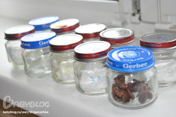 Использованы эфирные масла на ватный диск, натуральный матерьял ( в случае с кофе, бадьяном и чесноком), и отдушки (после моего увлечения мыловарением остались).