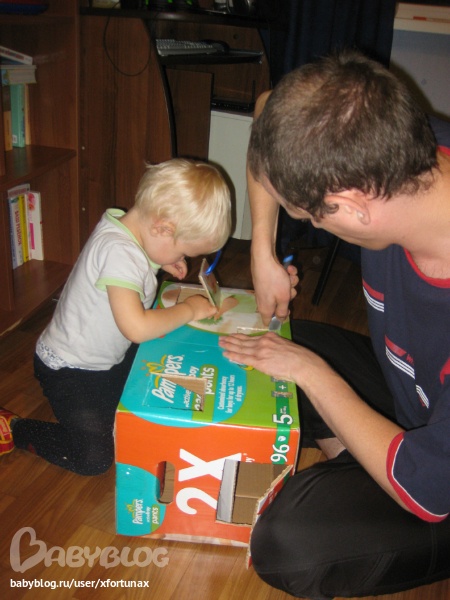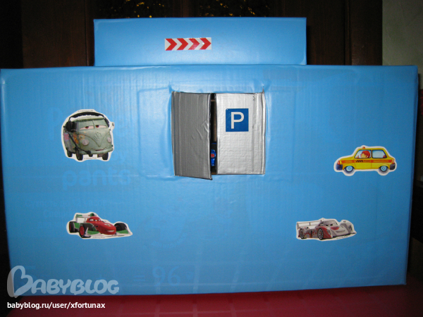 Машинки в доме валяются везде и всюду, а чтобы их сконцентрировать хоть как-то в одном месте, возникла идея соорудить для Вани гараж из коробок от памперсов.