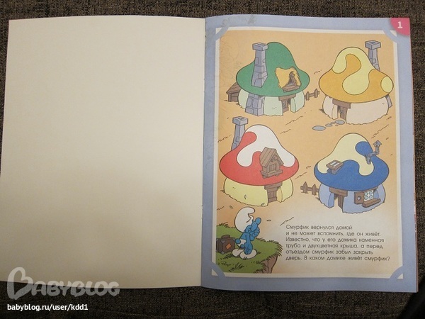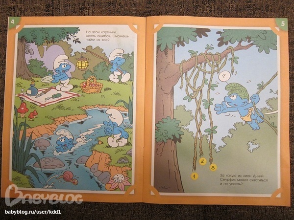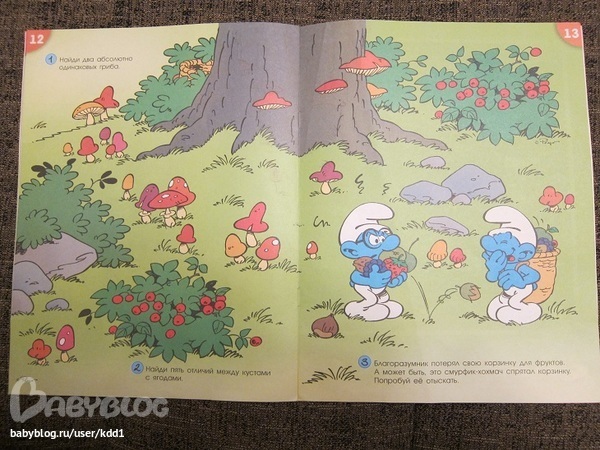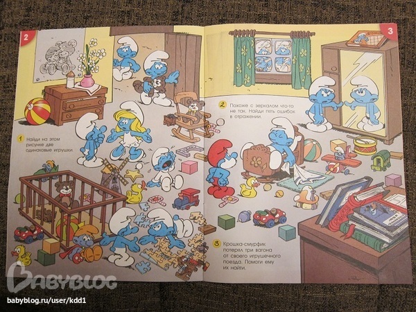 Самый лучший разворот. Предлагается три задания, но на самом деле можно придумать еще уйму, например, посчитай сколько на картинке изображено смурфиков/кубиков/мячиков/мишек, какого цвета конкретные игрушки, найди игрушку, которая находится за/перед/внутри/между, что на картинке с крыльями/пропеллером/колесами/одноцветное/двухцветное и т.д.