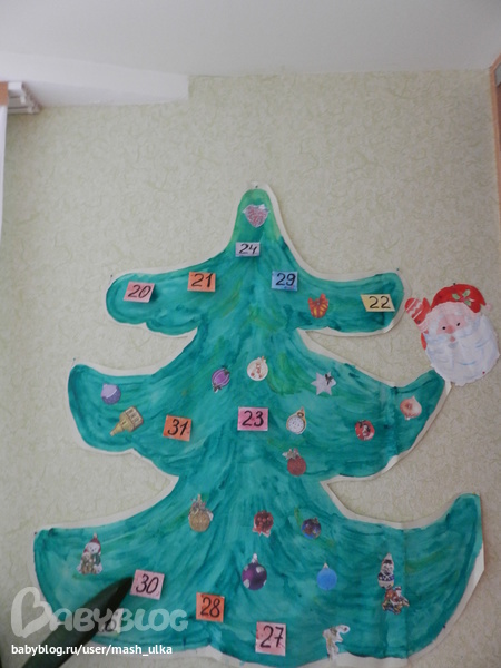 Елку нарисовала на обоях, раскрасила, сделала 31 надрез. В каждый надрез вставила конвертик, тоже сама клеила, украшала, на каждом конверте написала число. Вешала в разброс. В каждом конверте - наклейка с изображением елочной игрушки: нашла картинки в интернете, распечатала на самоклеющейся бумаге. То есть 1 декабря елка была украшена только конвертами с числами.