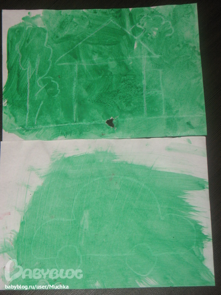 5. "Волшебные краски" - на листе сначала свечой делаются контуры, а потом лист раскрашивается - картинка вроде бы появляется сама по себе. Но Леру это не особо вдохновило)
