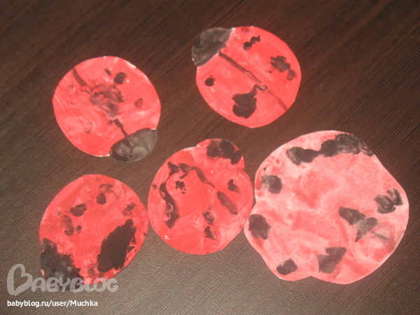 Божьи коровки - вызвали восторг почему-то. Раскрашивала их Лера сама, сама пальчиками ставила точки. Потом попросила сделать для жуков маму. И тоже сама ее раскрасила, меня попросила не мешать)))