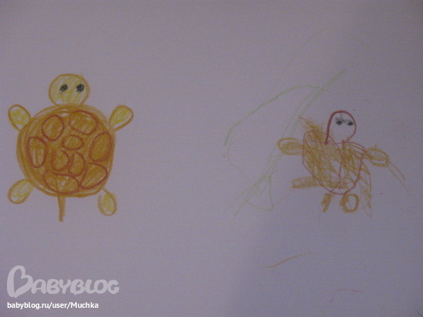 2. Рисуем вместе. Я показываю - Лера повторяет. Сегодня черепашек рисовали, а вообще рисуем рыбок, домики, машинки - все что на ум придет)