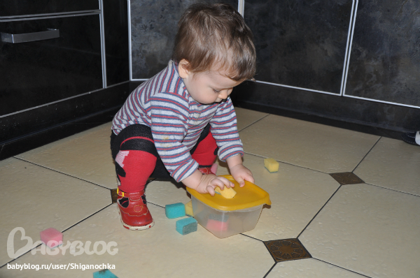 Внутри нарезанная губка, полезно для развития сенсорики. Малыш пробует на ощупь разные по качествам предметы - мягкое, шершавое. Губки еще очень приятно сжимать в малньких ручках.