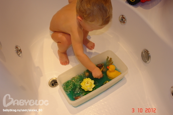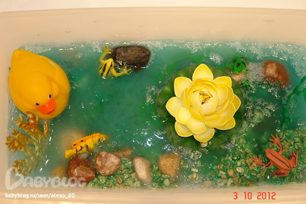 3. Сделала я Матвею пруд из желе. Залила двумя слоями. В первом слое камни, водоросли, сверху лягушки, кувшинка, рыбки, а-ля ряска) Проснулся я ему говорю, пошли я покажу какой у тебя прудик в ванне появился, помчался) стал на свою подставку, заглядывает. Спрашиваю пойдешь знакомиться?, да! Обычно разрушитель, а тут дотронулся – непривычно, холодно и скользко. Потом подоставал лягушек, кувшинки и пошел их мыть под воду)))