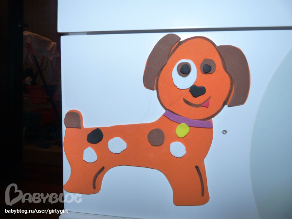 собачка-аппликация: у неё отлепляются глазки, ушки, носик, хвост, пятнышки и ошейник.