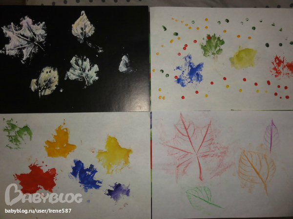 спасибо! фартучек обязателен )) а про листочки-надо рисовать на задней стороне листика, где есть прожилки, потом положить на лист, пальчиками погладить и оставить на 5 минут полежать, в это время Злата на свободную тему рисует, а потом уже отклеиваем листочки и восхищаемся! повторяем очень часто, благо листиков полно!!!