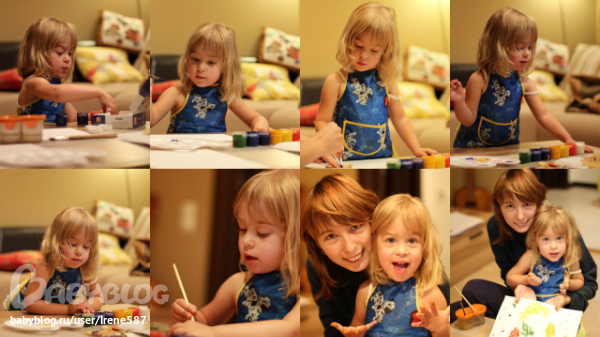 Злата так старается, такое личико серьезное, прямо вся в творческом процессе. И фартучек одевает, умница. А моя ни в какую, я ей купила тоже типа фартучка только с рукавами, специально для рисования, так и валяется он уже месяца 3 без дела))) не понравился! Как вы делаете, чтобы отпечатки четкие были. как на последнем примере? у нас одно сплошное пятно получается...