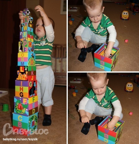 Игры и игрушки для детей от 2х-до 3-х летПирамидка была куплена давно, и в принципе сразу нам полюбилась. Особенно радовало Алешку то, что она во весь его рост. Он ее строил а потом весело и шумно ломал. Ну и соответсвенно собирал ее вновь. Не видели мы игрушку пару месяцев точно а то и больше. И вот опять она у нас перед глазами. Ребенок играет каждый день с ней. И выстраивает башню и собирает кубики один в один. Ну и соответсвенно начал озвучивать что это "пиида" т.е. пирамида))))