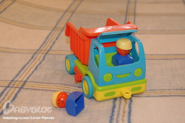 Грузовик Мне он приглянулся тем,что есть 2 фигурки человечков,которые сидят в кабине и которых можно вытащить и играть отдельно.Колесики прорезиненные.Вообще,машинка какая-то такая вся приятная на ощупь,без острых углов.