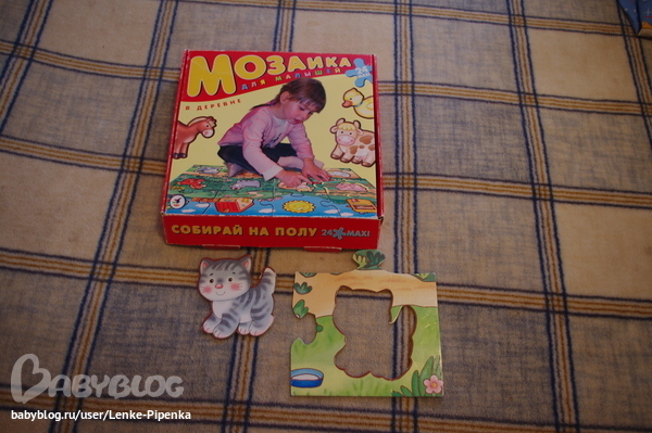 Играем в нее,наверно,с годика.Крупные детали,милые зверята.Доча уже давно сама находит нужные окошки для животных,выкладывает каждый фрагмент по отдельности,правда собрать мозаику полностью так ни разу и не получилось-мы все в кучку сгребаем.