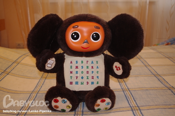 3. По наследству к нам перешел и Чебурашка.Полезный помощник в изучении букв и цифр.Верочке нравится за ним повторять (пока что все,кроме стихов).Единственное,что я бы исправила в игрушке-озвучку,т.к. звучит женский голос,который лишен каких-либо эмоций и интонации.Как-то скучновато рассказывает она стихи.Но,пожалуй,это мое мнение.Вот муж мой ничего такого не приметил,доче все нравится.:-)