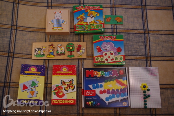Мозаика Мне она очень нравится!!!Такая приятная на ощупь,крупные детали,развитие моторики+изучени/сортировка цветов.Доченька сама справляется с втыканием/вытыканием фишек,пытается составлять картинки.Некоторые фишки вставляются как бы с зазором и потом вываливаются.
