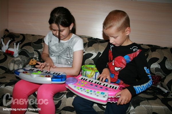 К вечеру у Саши была еще одна радость - папа привез с дачи кошку! А в воскресенье приехали еще гости - моя сестра с двумя детьми. Ко всему прочему, муж взял на выходные свою старшую дочку от первого брака. Дети оторвались по максимуму в пределах возможностей нашей жилплощади. Они переиграли во все Сашины игрушки. Устроили безумный коцерт из двух синтезаторов, трубы, гитары и барабана. Играли в прятки и "горячо-холодно". Занимались еще непонятно чем и просто "стояли на головах". Я, по-моему, отошла он празднеств только сегодня.