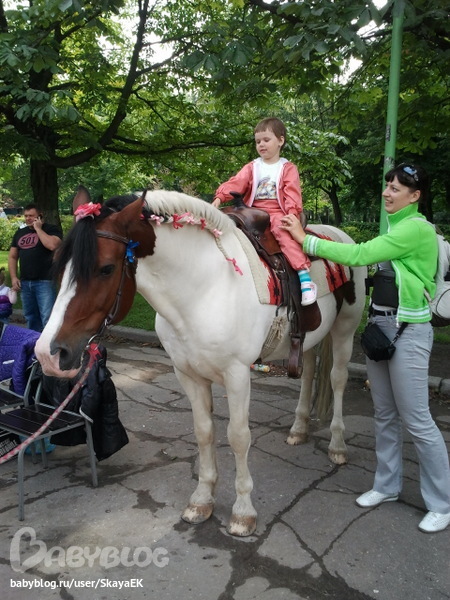 В пятницу в гости напросилась Сашкина крестная со своей дочкой - моей крестницей (ей 8 лет). Сашка сидит их крайне редко. Посему понячалу стеснялась и все терлась около меня. Но, потом вошла во вкус. Заранее для девчонок я приготовила отдельный "творческий" столик. На нем разложила бумагу разных видов, картон, краски, пластелин, загтовки для аппликаций и т.п. Перелапатив весь столик (хватило довольно на долго) девчонки отправились разносить по частым Сашкину комнату. Крестница моя - девочка довольно талантливая, но супер гиперактивная с самого раннего детства. Никогда в жизни я не видела такого разгрома в квартире как после ее отъезда. Собирала я игрушки и все, все, все до часа ночи. Сашка тоже легла довольно поздно, уже после десяти. Вырубилась еле донеся голову до подушки. На следующий день папе пришлось уехать на дачу, вывозить от туда бабушку и кошку. Мы с Сашкой продрыхли все на свете, а проснувшись решили таки ехать на аттракционы. Возможно, именно потому что мы были лишь вдвоем, дочка вела себя довльно тихо и даже не захотела кататься на своей обожаемой "гусенице" (к моей великой радости, я эту гусеницу терпеть не могу). Покаталась на карусельке, на лебеде в бассейне, на паровозике. И, конечно, на большой лошадке. Как оказалось, ребенок не понимает, что пони - это тоже лошадь. Это мы выяснили не так давно. На даче мы почти каждый день ездили кормить местных лошадок. И когда Саше впервые предложили покататься на маленькой лошадке в парке, она не наотрез отказалась, пояснив, что кататься она будет только на большой. Пришлось катать на большой, не испугалась, понравилось. Вот и в этот раз, она сразу понеслась к белому коню - Ирису и "проскакала" на нем большой круг. Фотка с конца лета, так как в этот раз не брала с собой фотик, снимать было не кому. Но лошадь была та же.