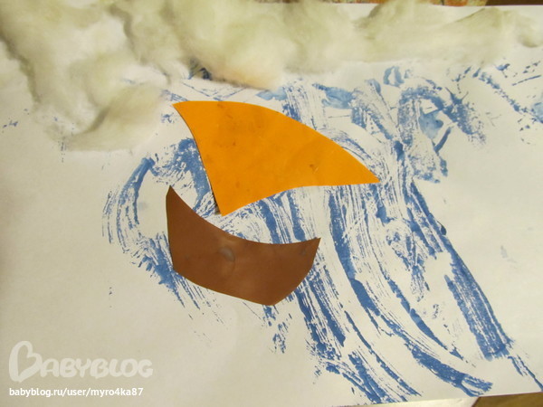 На полиэтилене с помощью синей и белой краски, воды и кисточки Соня рисовала море, затем получившийся рисунок мы промокнули на белый лист, приклели из ваты облака, а из цветной бумаги - корабль.