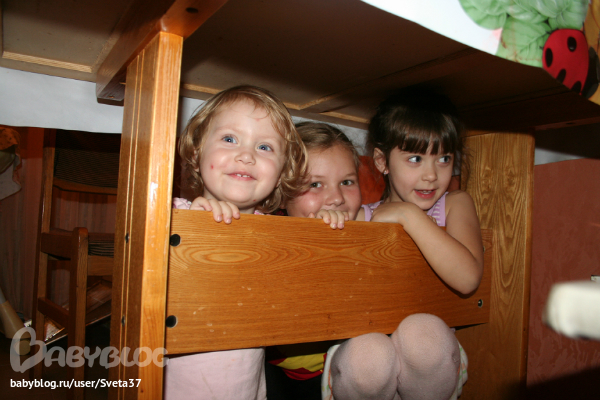 Когда взрослые вышли из кухни, детки забрались под стол, что бы подшутить над мамами. Когда мы зашли, они кричали "Я говорящий стол" и хохотали, так им эта забава понравилась.