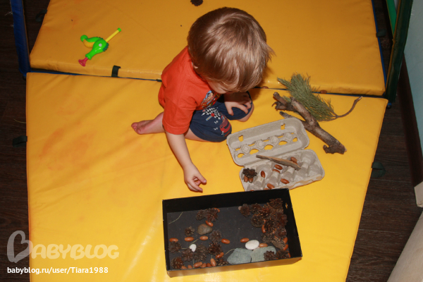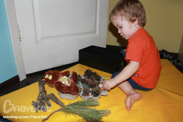 Помогали Мишке навести порядок- перекладывали из коробки в коробочку от яиц! Даня все говорил -" Ох Миша, миша...бадяк (бардак)"