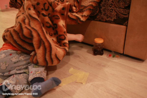 Играли " У Мишки пропал горшочек меда" ! Налипила стрелочки( малярным скотчем) на ленолеуме и спрятала мишкин мед...Даня должен был найти мед..идти по стрелочкам и искать ..." Тепло -близко мед , Холодно- совсем там его нет". Такая игра очень понравилась Даньке и он с удовольствием хотел помоч Мишке найти его еду))