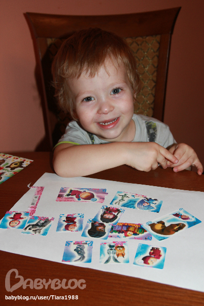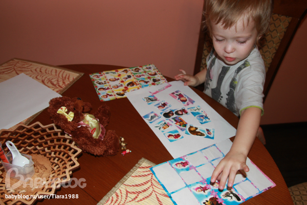 Клеили наклейки - Даня сам выбирал какую будет клеить и клеил там где хотел!!! Придумывали истории про Машу и медведя!!