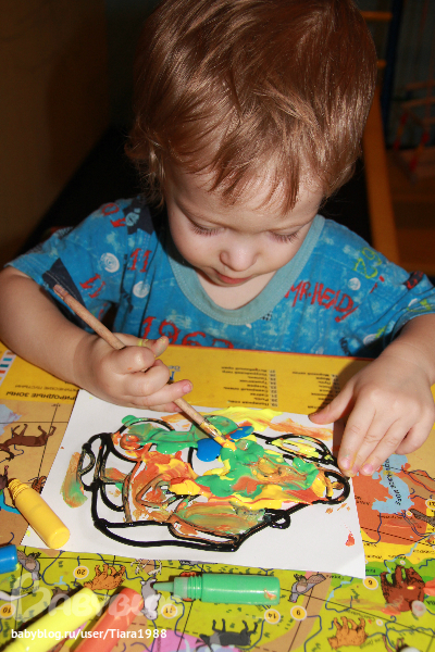 Рисовали витражными красками-витражи..решил , что надо смешать все цвета и кисточкой все размазать!) Мешать не буду-пусть творит)