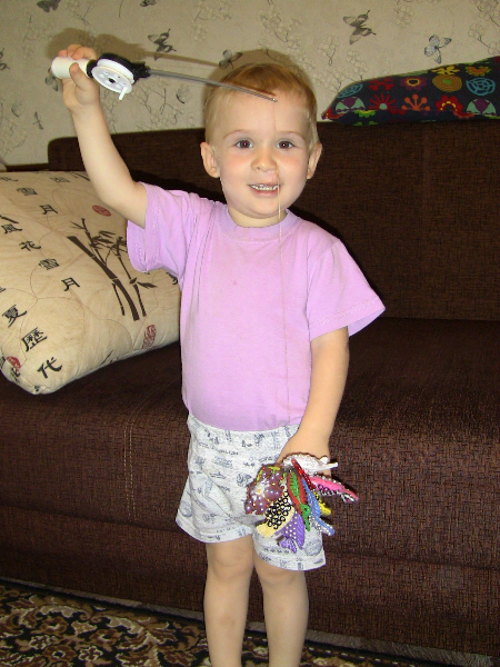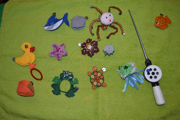 Поэтому я нафантазировала разных рыбок, достала фетр, разные бусинки/пайетки/ бисер и пр. материалы и сшила сама. В качестве удочки - настоящая удочка для зимней рыбалки. Крючок - круглый магнит. К самим рыбкам пришита обычная канцелярская кнопка. Рыбки с двух сторон одинаково расшиты. Изначально с глазами были все :) Рыбалка наша - исключительно сухопутная. сын в восторге носился с ней больше месяца. На данный момент поостыл, пока припрятала :)