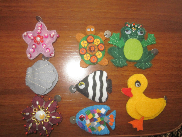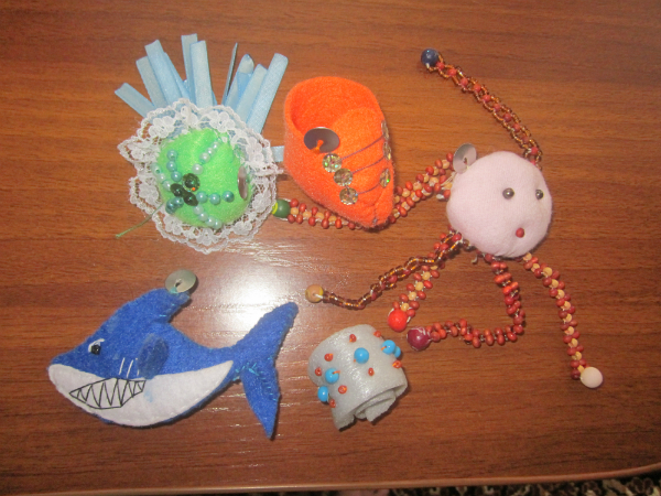 Спасибо! Все шила на руках, выкройки тоже сама рисовала, увы поделиться не смогу - давно канули в мусорно ведре:( Шьется все очень легко, фетр очень прост в работе. А вот украшать это все и расшивать - это да, это не легко. Но ни кто не заставляет повторять все в точности, украсьте ваших рыбок просто пуговицами - будет не менее красиво и оригинально! А что именно вам не понятно в шитье? Каждая рыбка состоит из двух деталей. Каждая деталь украшалась отдельно, старалась все украшения и внешние стежки делать параллельно. Затем обе половинки сшивала "обметочным" швом (вроде он так называется), иногда добавляла набивку в самих рыбок. Самый простой - это осьминог, просто шарик с фенечками из остатков бусин. Еще раз спасибо за комплимент моим рукам! Если что-то еще интересно - спрашивайте, обязательно отвечу!
