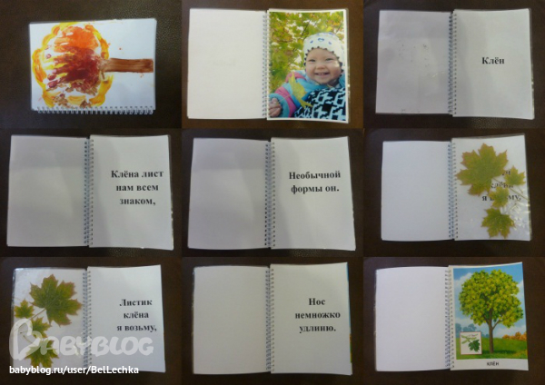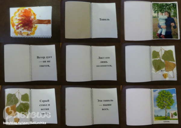 А еще из оставшихся материалов сделали самодельные книжки. Принцип такой: обложка-дерево из ладошек, наименование дерева, затем фотография Танюши с этим деревом, на двух страницах по строчке из четверостишия про это дерево, заламинированный гербарий, затем еще две строчки, и карточка с соответствующим деревом. И так о каждом. Получилось 2 книги в каждой по 7 деревьев. Карточки у нас проф-прессовские были, формата А5, вот и книга такая же.