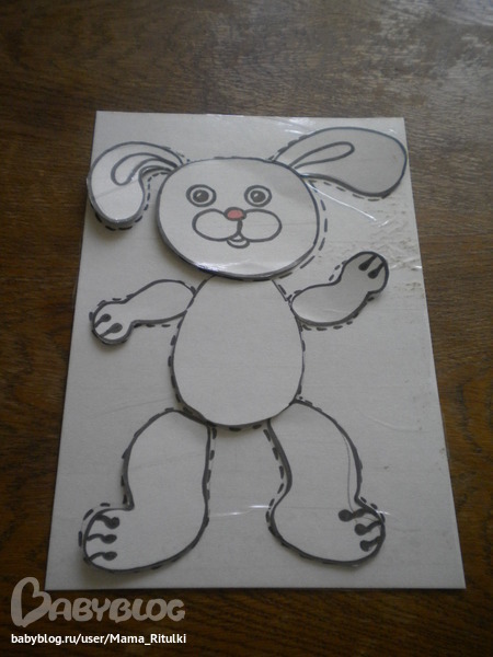 А потом на зайку же сами и напали. По типу как у той же Барто: "уронили зайку на пол, оторвали зайке лапу. А еще усы, и хвост, и уши, и голову"....ну потом же мы все это собрали. Порадовало, что Ритулька собирала правильно. Промахивалась, может, в сантиметр, но на свои места все собрала)))