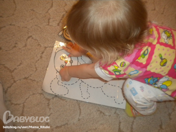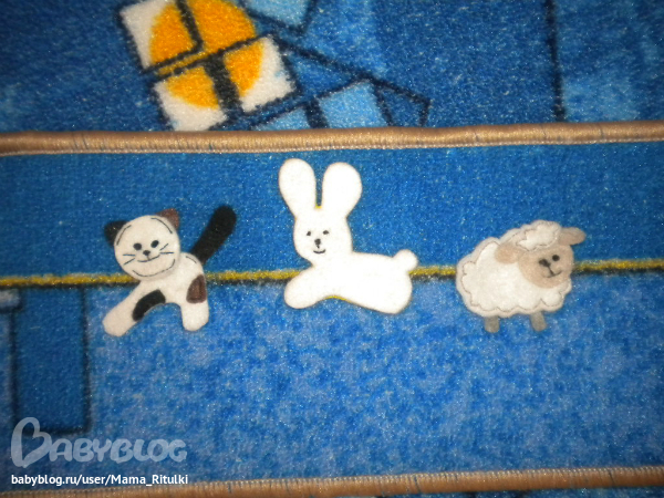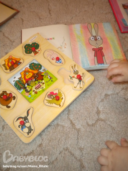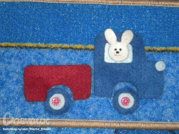 Потом мы собирали вот такой нехитрый пазл из фетра. Ну понятно с помощью мамы. Больше всего Ритуле нравится сажать зайку в кабину. Бывает промахиваемся, но в основном попадаем))